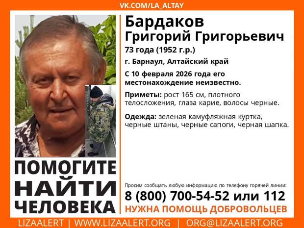 В Барнауле пропал 73-летний Григорий Григорьевич Бардаков. О его местоположении неизвестно с 10 февраля, сообщает поисковый отряд "ЛизаАлерт".