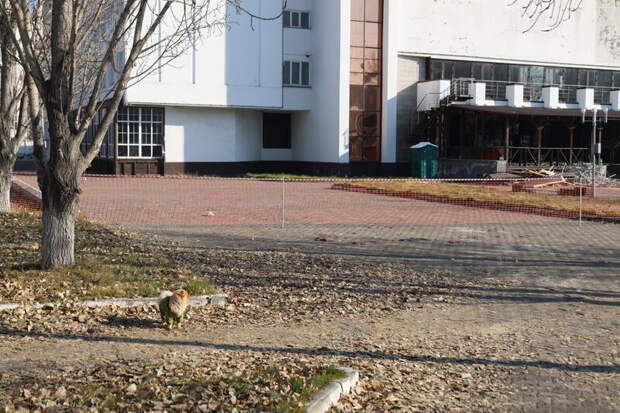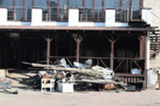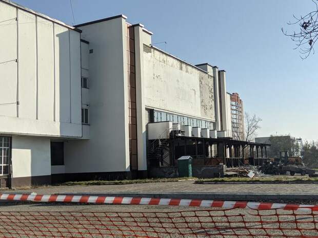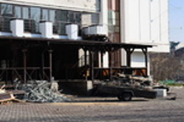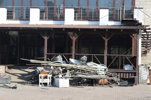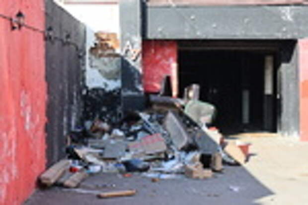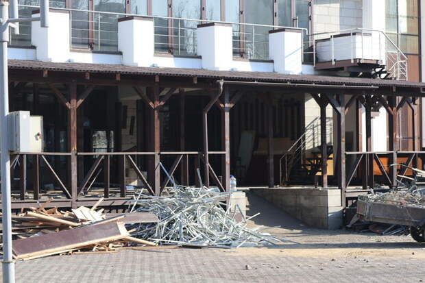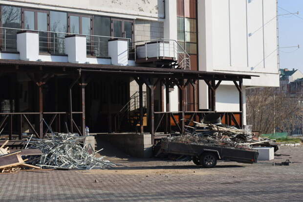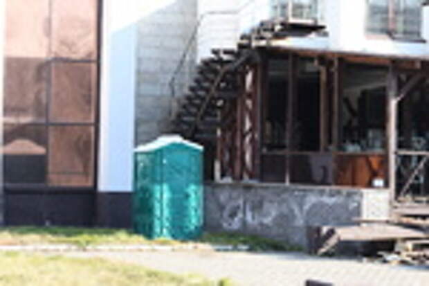 Демонтировали вывеску, выносят оборудование и мебель. Возле здания много мусора. Для рабочих установили туалетную кабину.