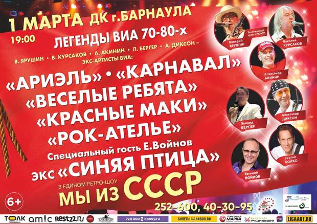 В ДК города Барнаула 1 марта 2026 года пройдет концерт "Легенды ВИА 70–80-х. Мы из СССР" в рамках юбилейного тура. Творческий коллектив и программа были созданы 20 лет назад.