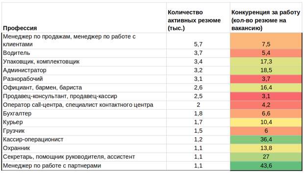 На серьезную конкуренцию за работу придется настроиться тем, кто ищет место менеджера по работе с партнерами (43,6 резюме на вакансию), кассира-операциониста (36,4 резюме на вакансию), секретаря (27), администратора (18,5), упаковщика (17,3), официанта, бармена, бариста (16,4), охранника (13,8), курьера (10,4).