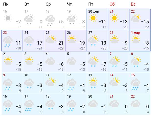 Последняя неделя зимы — с 23 по 28 февраля — будет морозной. Дневные температуры ожидаются на уровне -20 градусов, а ночью столбики термометров будут опускаться до -30.