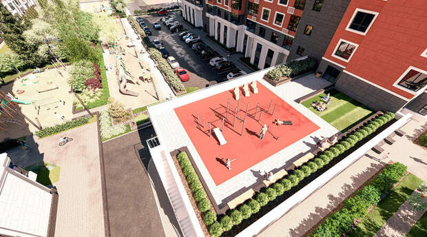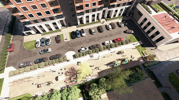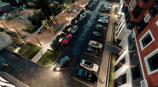 На участке заложено 29 машино-мест, на прилегающих территориях – 52, в подземном паркинге – 72. На территории двора и эксплуатируемой кровле паркинга размещаются площадки для игр детей, занятий физкультурой, для отдыха взрослого населения.