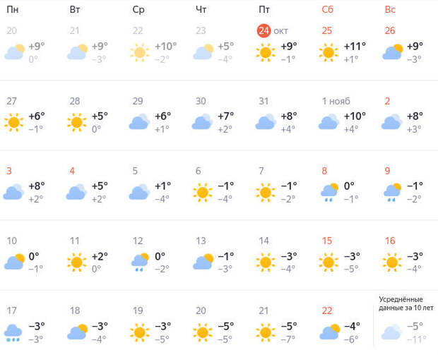 Так будет и в последние выходные в октябре. Об этом говорят данные популярных сервисов прогноза погоды "Яндекс.Погода" и Gismeteo.