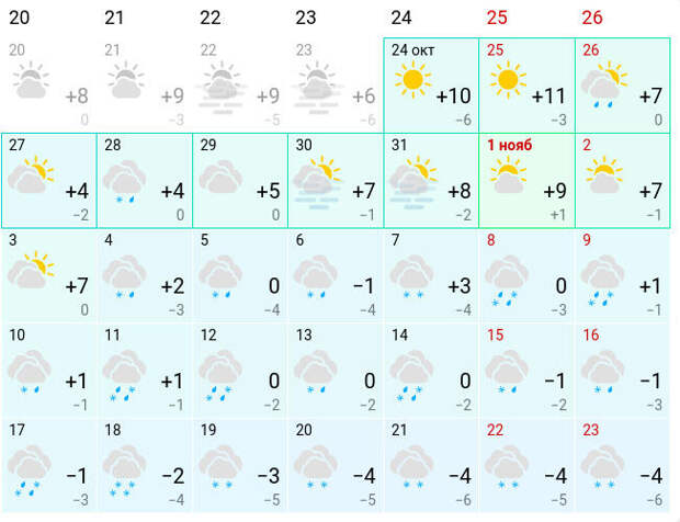 В воскресенье, 26 октября, ожидается +7...+9 градусов. Однако в этом случае сервисы немного разошлись в прогнозе: будет либо просто облачно, либо облачно и с дождем.