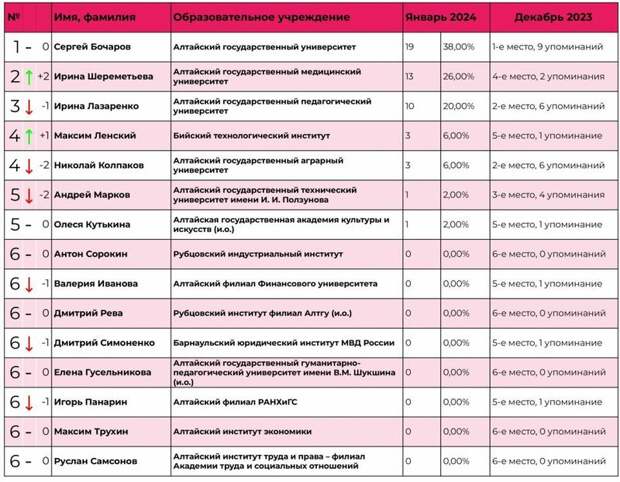 - ректор АлтГПУ Ирина Лазаренко – 3 место, 10 упоминаний.