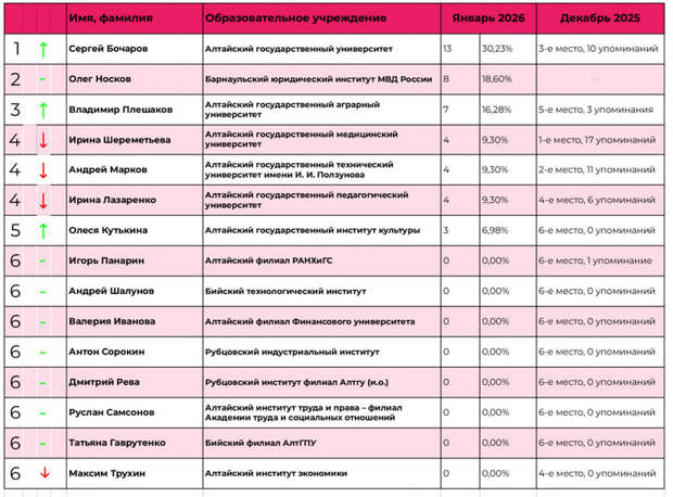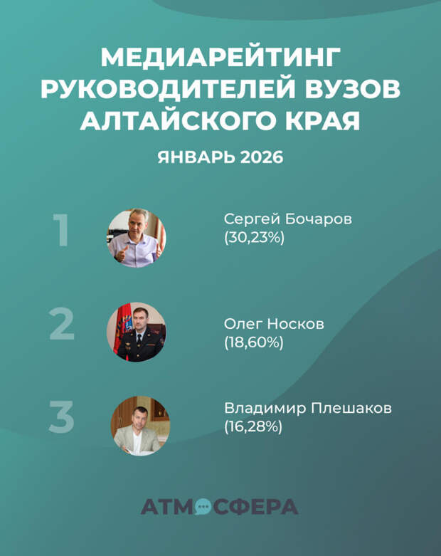 «На первом месте — ректор АлтГУ Сергей Бочаров, месяцем ранее занимавший третью позицию. На второй строчке начальник БЮИ Олег Носков, назначенный на должность в конце января. Замыкает тройку и.о. ректора АГАУ Владимир Плешаков, в декабре располагавшийся на пятом месте», — отмечает издание.