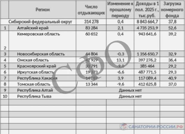 Алтайский край возглавил рейтинг сибирских регионов по прибыли санаториев за первые шесть месяцев 2025 года и числу отдохнувших, а также по этим показателям вошел в топ-6 по РФ, сообщает сайт "Санатории-России. рф"
