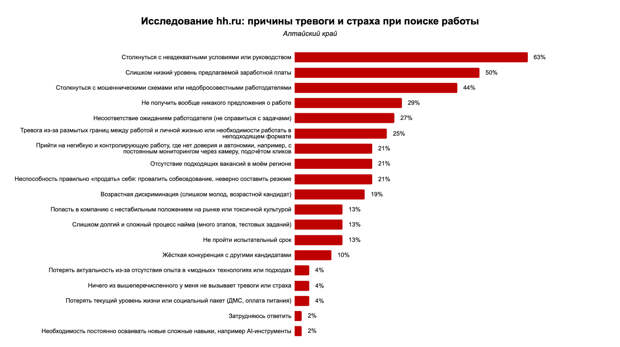 В Алтайском крае в тройку наиболее распространенных тревог, связанных с поиском работы, вошли: неадекватные условия или руководство (63%), низкий уровень зарплаты (50%) и страх столкнуться с мошенническими схемами или недобросовестными работодателями (44%).