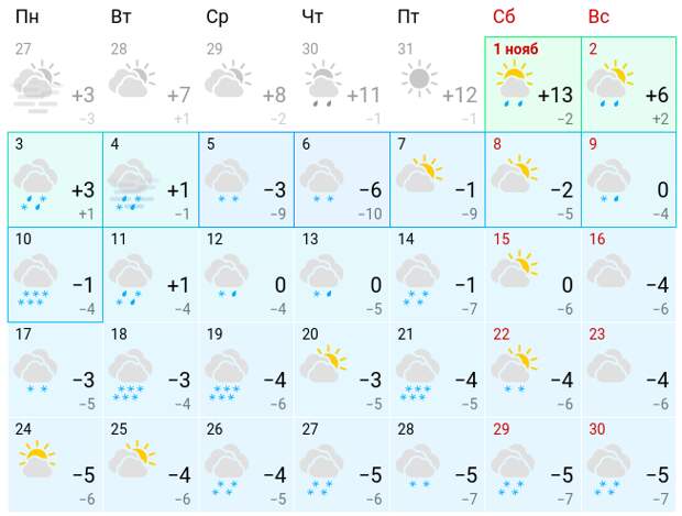 С 10 по 16 ноября потеплеет. В среднем будет около 0 градусов. Последние две недели ноября, согласно долгосрочному прогнозу, ожидается -3...-5 градусов.