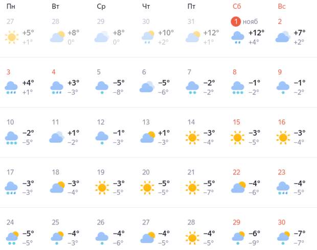 1 и 2 ноября - последние по-летнему теплые выходные в этом году: +13 и +6 градусов соответственно. На следующей неделе, с 3 по 9 ноября, будет уже не так солнечно, но и не холодно, как обычно бывает в ноябре. Да, ожидаются дожди и снег, но он быстро будет таять. Солбики термометров, как показывает прогноз, покажут от небольшого плюса до небольшого минуса.