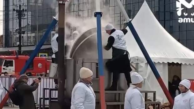 В огромном котле объемом 3000 литров варили суп из голов кеты, сазана, судака, верхогляда и красноперки — всего ушло более 1,2 тонны рыбы.