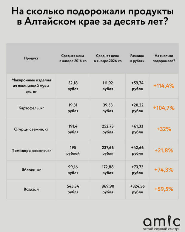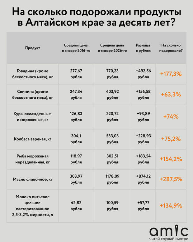 Поностальгируйте и вы.Цены за январь 2016 года мы взяли из единой межведомственной информационно-статистической системы (ЕМИСС), а нынешние – из актуальной сводки Алтайкрайстата за 12 января 2026 года. Подчеркиваем, что в обоих случаях указаны средние цены по региону, которые могут заметно отличаться от стоимости в конкретных магазинах.