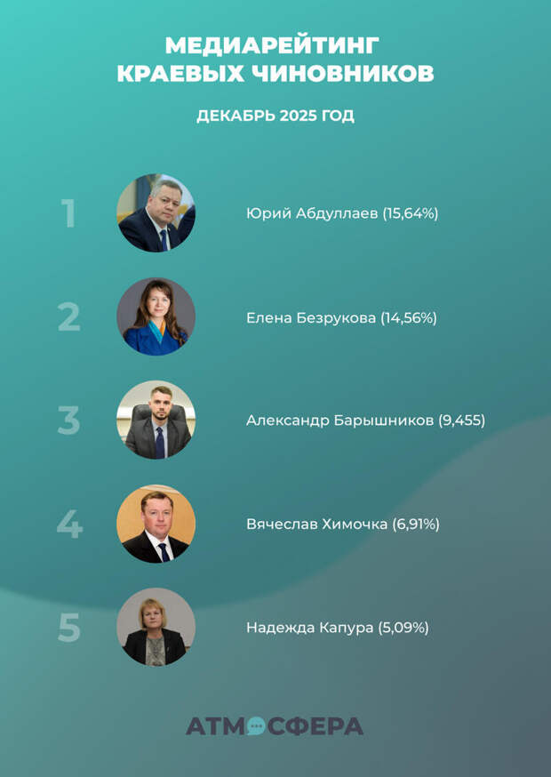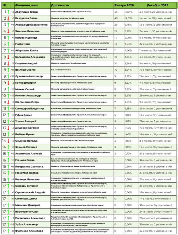 Заместитель председателя правительства Алтайского края Юрий Абдуллаев стал лидером медиарейтинга госслужащих, которых чаще всего упоминали в СМИ в январе 2026 года. Исследование подготовила "Атмосфера".
