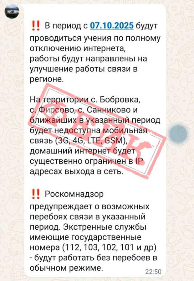 «Бобровка, Фирсово и Санниково останутся 7 октября без мобильной связи из-за учений по полному отключению интернета», - отмечается в ложной информации.