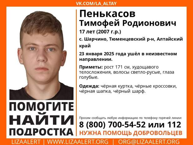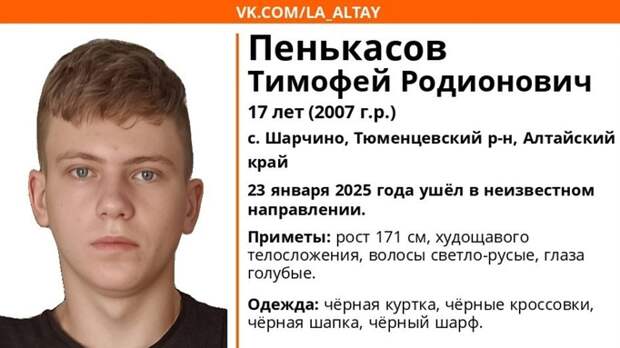 В селе Шарчино Тюменцевского района разыскивают 17-летнего подростка, который 23 января ушел в неизвестном направлении. Об этом на своей сообщает поисковый отряд "ЛизаАлерт" Алтайского края.