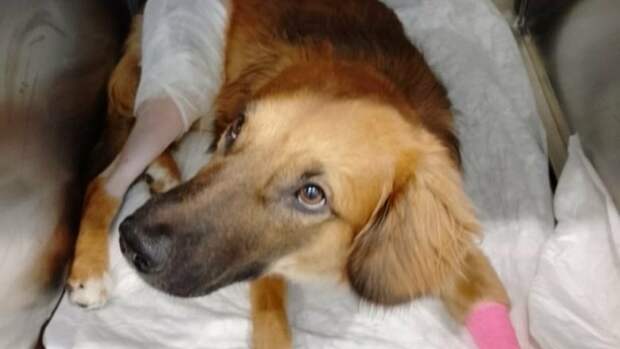Собаку забрали, больную лапу прооперировали, но наступать на нее пес не может. Сейчас ему ищут новый дом.