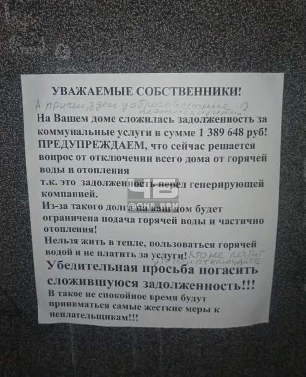 «Уважаемые собственники. На вашем доме сложилась задолженность за коммунальные услуги в сумме 1 389 648 рублей! Предупреждаем, что сейчас решается вопрос об отключении всего дома от горячей воды и отопления, так как это задолженность перед генерирующей компанией. Из-за такого долга на ваш дом будет ограничена подача горячей воды и частично отопления!» - говорится в объявлении.