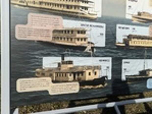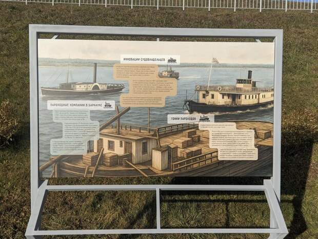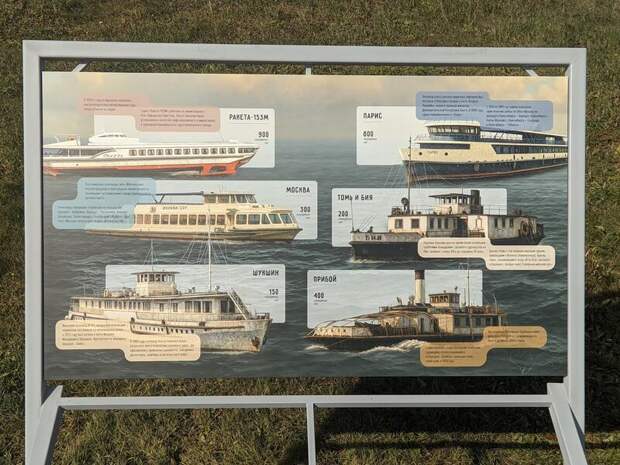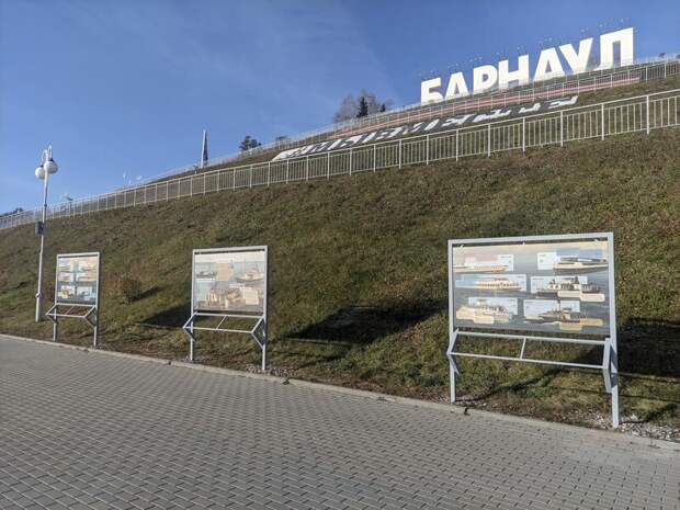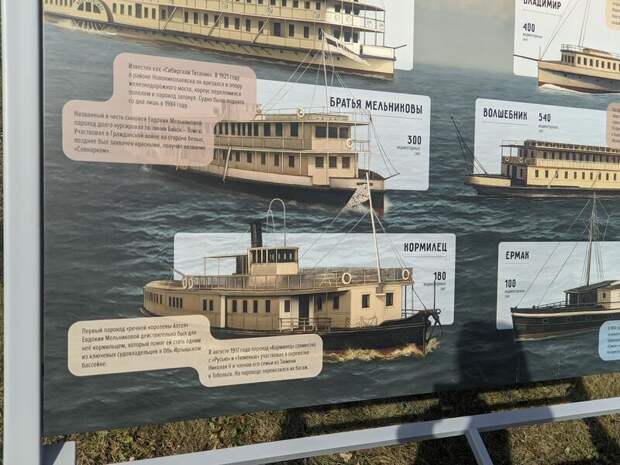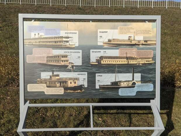 На информационных панелях представлены исторические пароходы, такие как "Иван Фуксман", "Братья Мельниковы", "Волшебник", а также более современные суда "Ракета-153М" и "Париж". Эти суда играли важную роль в транспортной сети региона, и их история тесно связана с развитием Барнаула и всего Алтая.