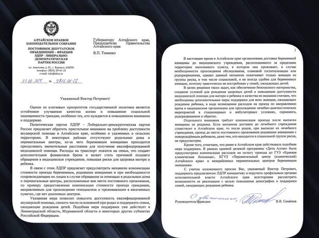 В Алтайском крае беременных женщин из отдаленных населенных пунктов направляют на обследование и роды в перинатальные центры крупных городов. Дорога порой занимает несколько сотен километров. А женщине на поздних сроках беременности или молодой маме с младенцем на руках после тяжелых родов нужны особенно комфортные, даже бережные, условия. К тому же, расходы на транспорт ложатся на семьи, что создает дополнительное финансовое бремя, поясняют в ЛДПР.