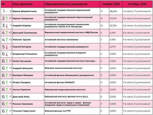 - ректор Алтайского государственного педагогического университета Ирина Лазаренко – 2-е место, 12 упоминаний;