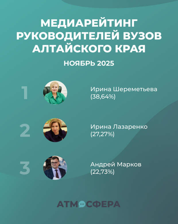 Ректор АГМУ Ирина Шереметьева возглавила рейтинг руководителей вузов Алтайского края, которых чаще всего упоминали СМИ в ноябре 2025 года. Исследование подготовила "Атмосфера".