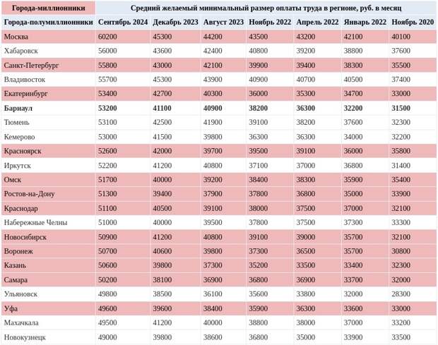 "В декабре прошлого года эта сумма была равна 41 100 рублей, в ноябре 2022-го – 38 200 рублей, а в ноябре - 2020-го - 31 500 рублей. В итоге за четыре года желаемый уровень МРОТ в Барнауле вырос с 31 500 рублей до 53 200 рублей", - говорится в исследовании.