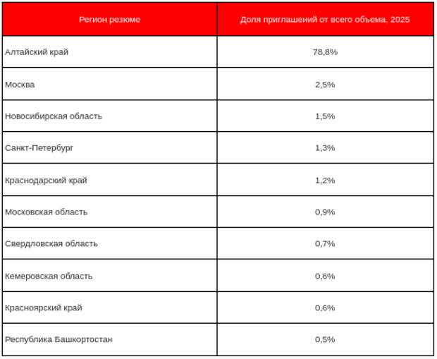 Анализ более 774,2 тыс. приглашений, которые работодатели в Алтайском крае отправили с начала 2025 года, показывает, что местные компании в первую очередь стараются рассматривать кандидатов из родного региона. Львиную долю приглашений компании адресовали местным соискателям: это более 610 тыс. или 78,8% от всего объема приглашений на работу.