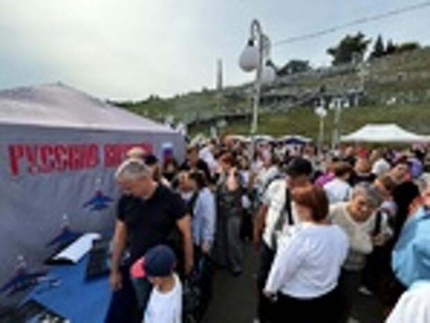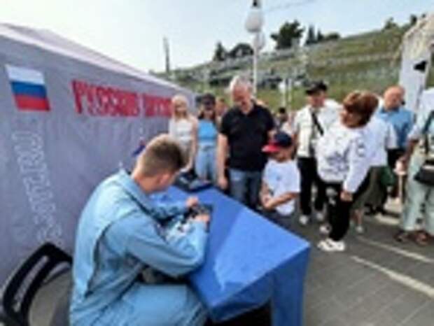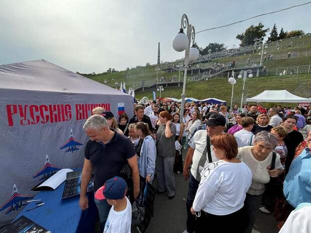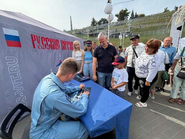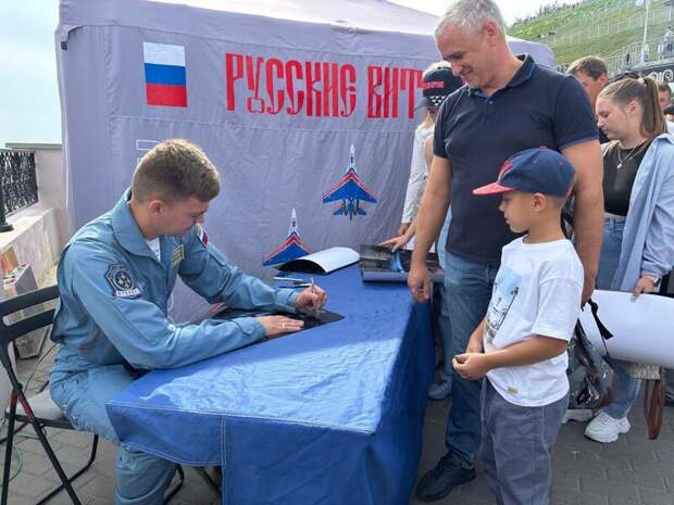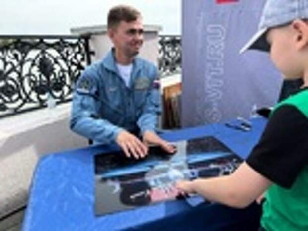 Авиационная группа высшего пилотажа "Русские витязи" провела автограф-сессию после полета-разведки над Барнаулом.