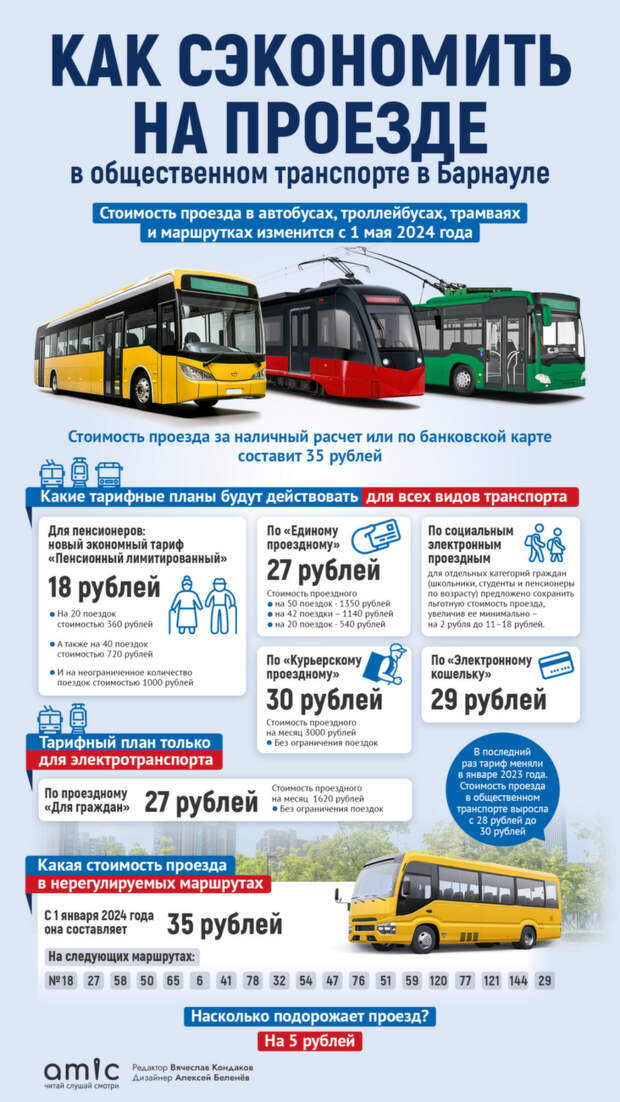 В Барнауле с 1 мая в общественном транспорте повысят стоимость проезда. Тариф для автобусов, трамваев и троллейбусов вырастет на 5 рублей. Таким образом, платить за проезд при расчете наличными барнаульцы будут 35 рублей. Чтобы жители краевой столицы могли минимизировать затраты, городские власти проработали тарифную линейку с использованием электронных средств платежа.