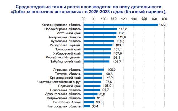 При этом, как отмечается в прогнозе на 2026-2028 годы, среднегодовые темпы по добыче полезных ископаемых составят 12,5%. А в Республике Алтай ожидается падение на 9,4%.
