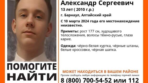 В Барнауле пропал 13-летний подросток. Ориентировку о поиске опубликовал поисковый отряд "ЛизаАлерт".