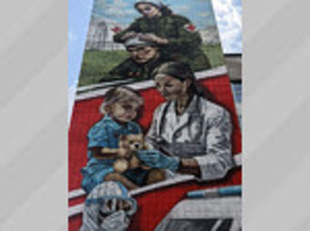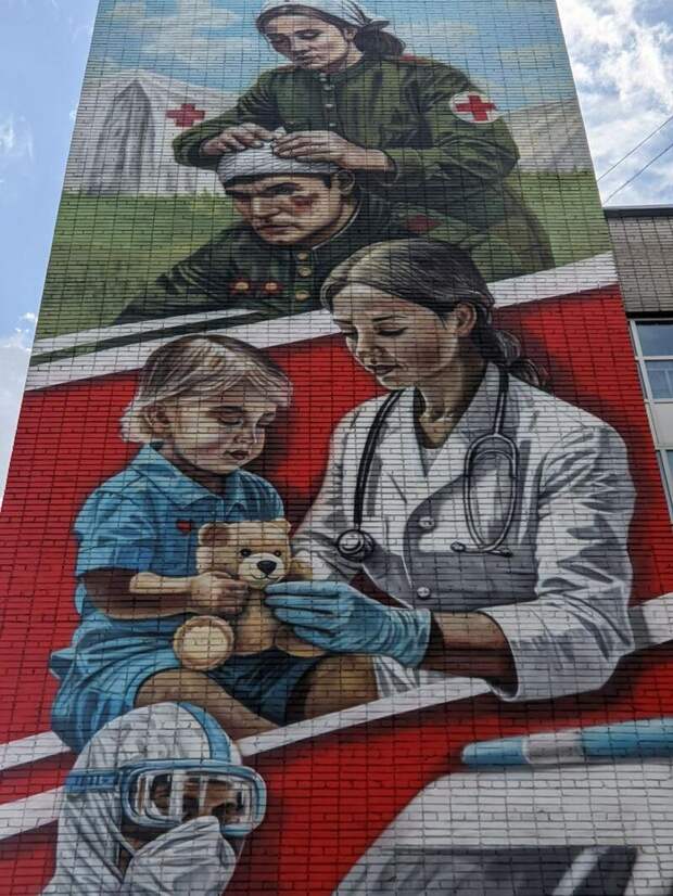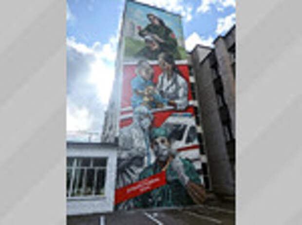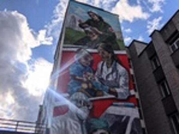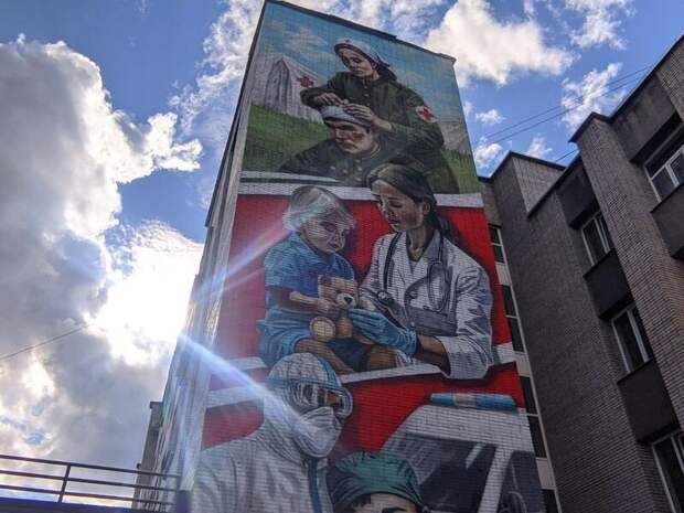 Мурал объединил образы военных врачей времен Великой Отечественной, медиков "красной зоны" пандемийной эпохи и современных студентов-медиков.