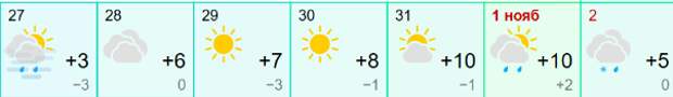 В этом прогнозе даты солнечных дней не совпадают с предыдущим, хотя их тоже два. По данным Gismeteo, понедельник, 27 октября, будет дождливым и прохладным - столбики термометров покажут всего +3 градуса. Облачным и более теплым будет 28 октября - воздух прогреется до +6 градусов. Синоптики обещают, что солнечными будут 29 и 30 октября - в эти дни воздух прогреется до +7 и +8 градусов соответственно. Самым теплым днем также будет 31 октября - температура воздуха составит +10 градусов. Ноябрь начнется с дождя. 1-го числа будет +10 градусов, а 2-го - +5.