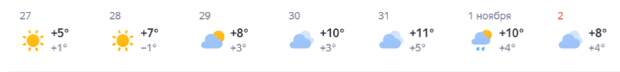 Согласно приведенному прогнозу, дни 27 и 28 октября будут ясными, а температура воздуха составит +5...+7 градусов. Отметим, что до конца недели воздух будет прогреваться постепенно. Так, с 29 по 31 октября столбики термометров поднимутся с отметки в +8 до +11 градусов.