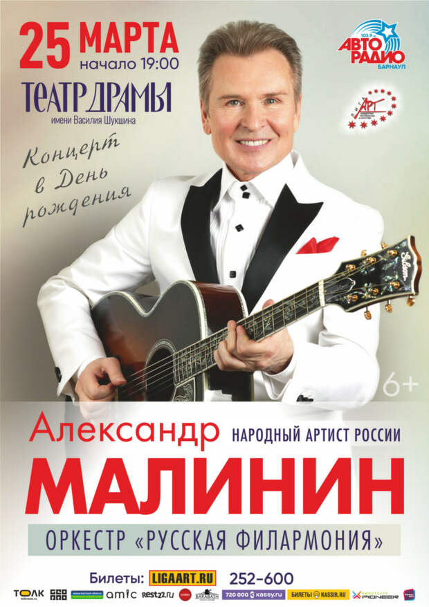 В Алтайском краевом театре драмы им. В.М. Шукшина 25 марта 2025 года выступит Александр Малинин – народный артист России, обладатель именной звезды на московской "Площади звезд" в ряду с такими корифеями отечественной эстрады, как Александр Вертинский, Леонид Утесов, Клавдия Шульженко.