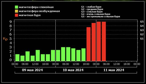 Наивысшей отметки G5 шторм достиг в 01:54 мск. До этого магнитную бурю аналогичной мощности управление объявляло в октябре 2003 года.