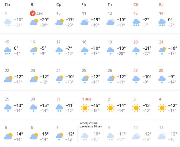 С 13 по 15 декабря ожидается около 0 градусов, снег и дожди. С 16 декабря начнет постепенно холодать. В субботу, 20 декабря, прогнозируется до -21 градуса.