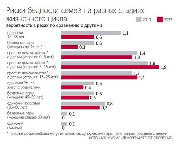 Согласно данным анализа, риск бедности у таких домохозяйств в 1,8 раза выше среднего. Еще сложнее положение у неполных семей, особенно если детям от 7 до 15 лет, – здесь рост в 1,9 раза, а у семей с подростками 16–25 лет – в два раза.