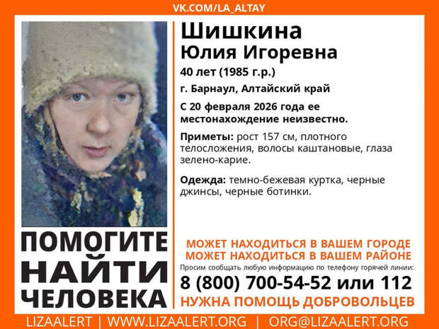В Барнауле пропал 40-летняя Шишкина Юлия Игоревна. О ее местоположении неизвестно с 20 февраля, сообщает поисковый отряд "ЛизаАлерт".