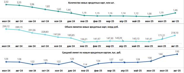 Всего в России за восемь месяцев 2025 года было выдано 9,49 млн кредитных карт с общим лимитом 1,25 трлн рублей, в среднем за месяц – на 155,63 млрд рублей.