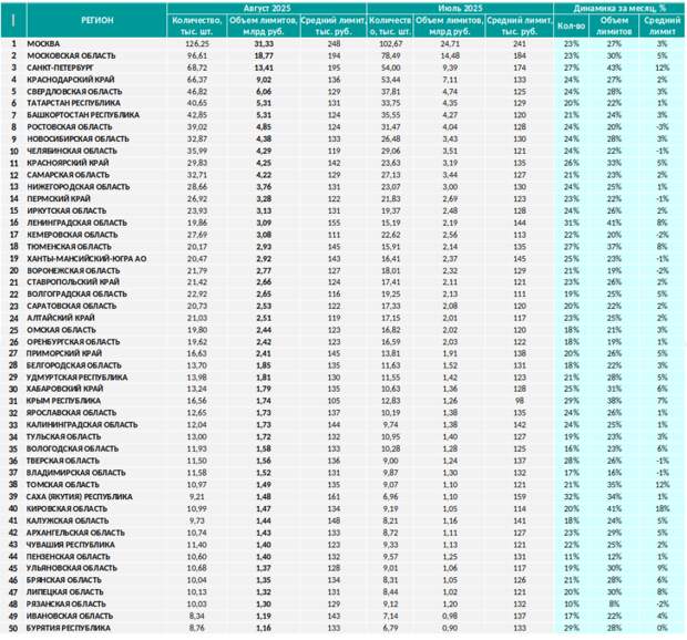 Регион в рейтинге занял 24-е место. В июле 2025 года в крае выдали 17,15 тыс. кредитных карт с общим лимитом 2,01 млрд рублей, а в августе – 21,03 тыс. карт на 2,51 млрд рублей.