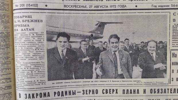 26-28 августа 1972 года проходил визит генерального секретаря ЦК КПСС, фактического главы СССР Леонида Брежнева в Алтайский край. Он приезжал в трудное для страны лето: в европейской части Союза от засухи выгорали поля, а на Алтае случился небывалый ни до того, ни после урожай.