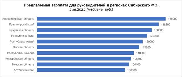 Что касается уровня оплаты труда, Алтайский край предлагает топ-менеджерам медианную зарплату в размере 100 000 рублей. Это ниже, чем в лидирующей Новосибирской области (146 000 рублей) и в Красноярском крае (138 200 рублей), но соответствует среднерыночным показателям по Сибири.
