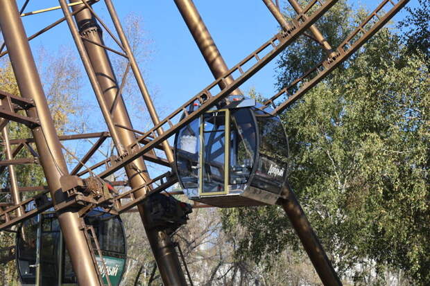В парке развлечений "Арлекино" в Барнауле продолжается строительство нового колеса обозрения. Рабочие начали навешивать первые кабины на уже собранный каркас.