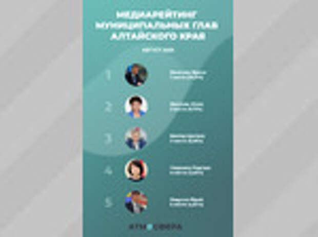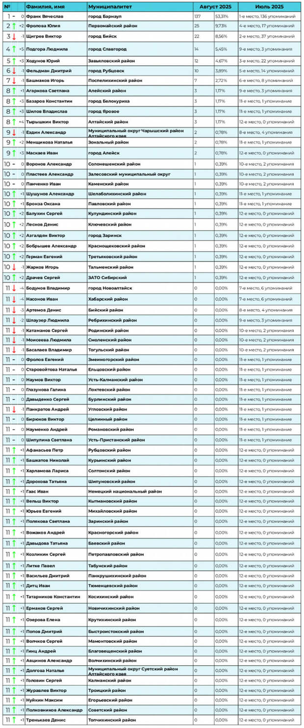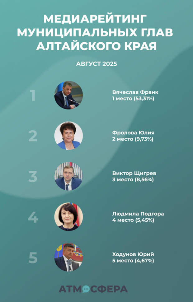«Первое место в августе у главы Барнаула Вячеслава Франка. С четвертого на второе место поднялась глава Первомайского района Юлия Фролова, которую в конце августа отправили в отставку в связи с возбужденным уголовным делом. Мэр Бийска Виктор Щигрев переместился со второй на третью строчку. На четвертой – глава Славгорода Людмила Подгора. Замыкает топ-5 глава Завьяловского района Юрий Ходунов, занимавший в июле третье место», – отмечает издание.