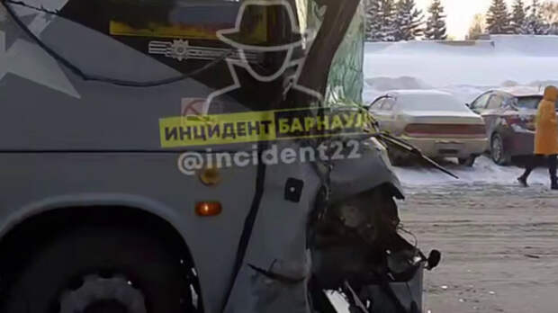 Судя по видео, опубликованному в паблике "Инцидент Барнаул", рейсовый автобус врезался в заднюю часть маршрутного. Удар был достаточно сильным — стекла разбились, а передняя часть рейсового транспортного средства смялась.