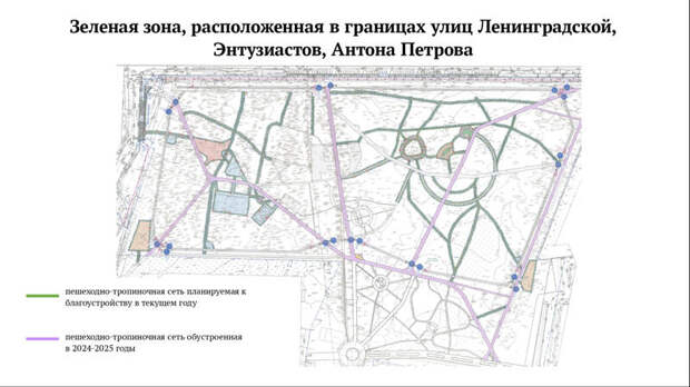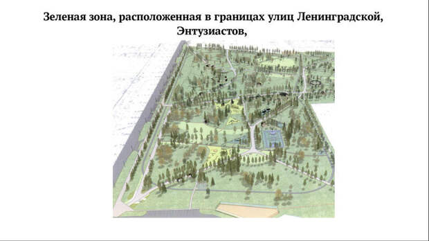 В планах — формирование пешеходно‑тропиночной сети, монтаж освещения и видеонаблюдения, посадка деревьев, обустройство вело‑беговой дорожки, спортивных и детских площадок, установка малых архитектурных форм.