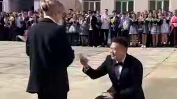 Мужчина прямо во время праздника знаний попросил девушку выйти за него замуж на глазах у коллег, школьников и родителей.